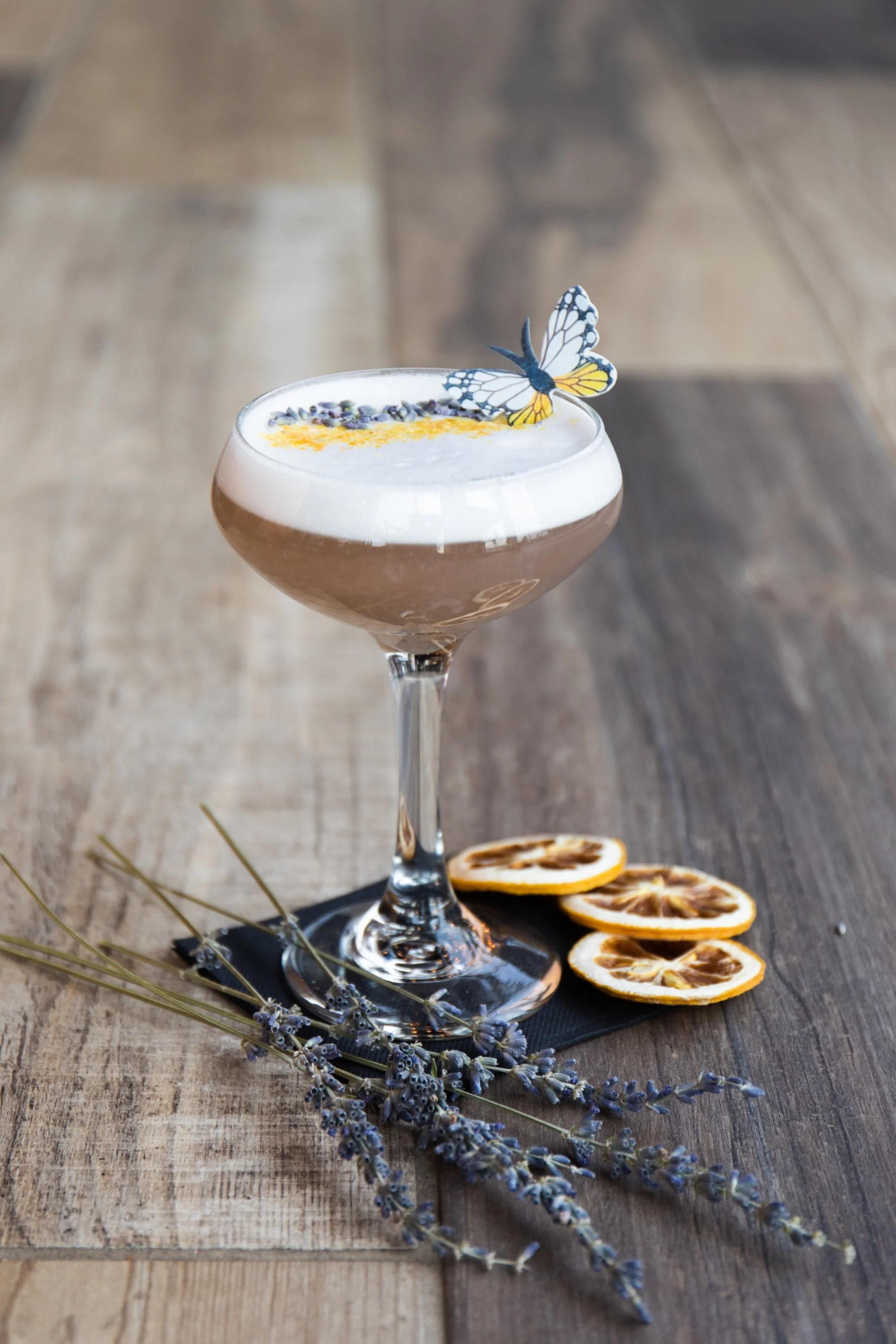 garnish: Lavender flowers, dehydrated lemon zest and a spritz of Crème de Violette