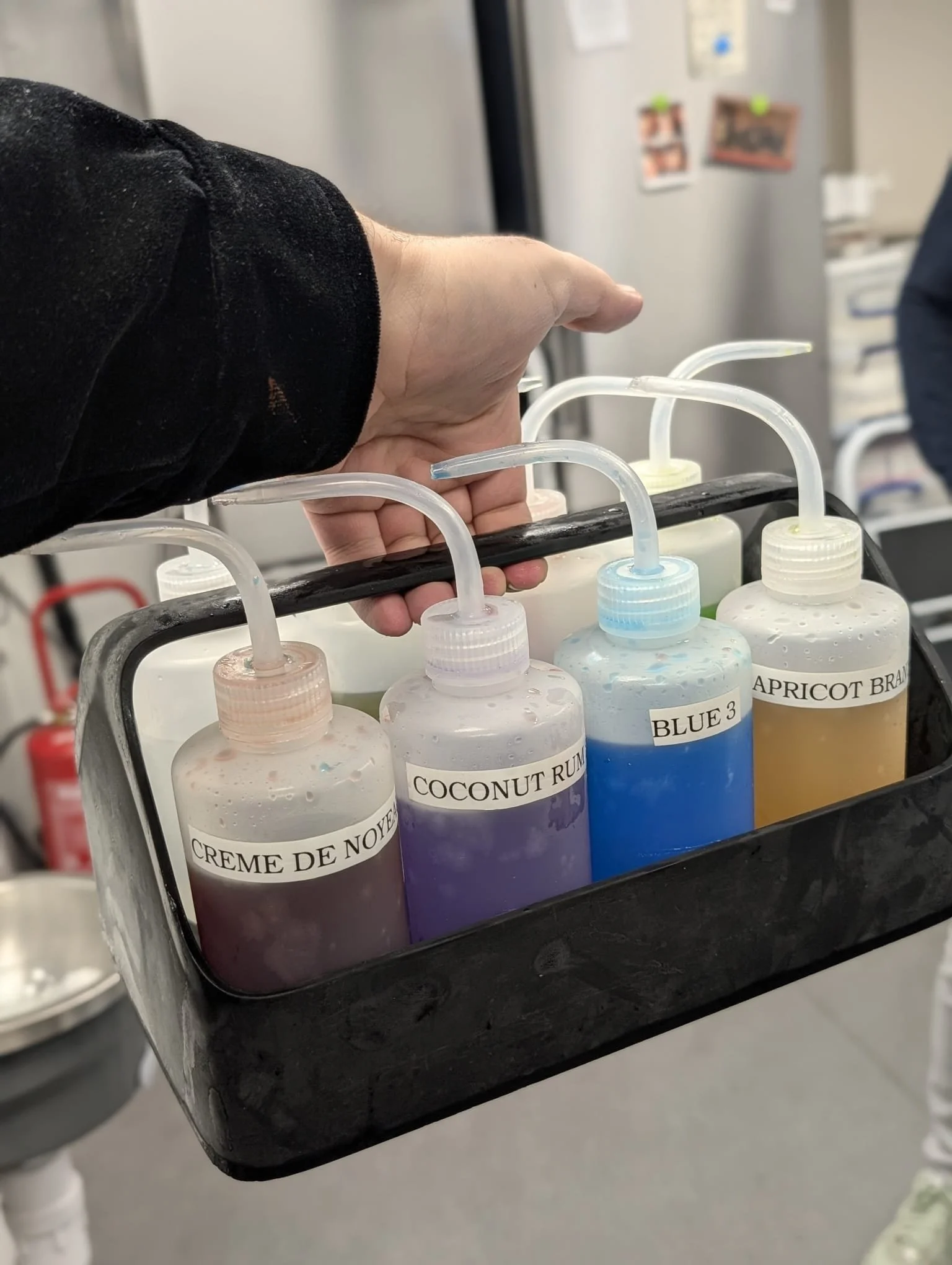 Sotti even figured out a fast and efficient way for bartenders to make the drink with its eight layers in 30 to 40 seconds. He and his team store all eight liqueurs in a single caddy in the freezer, which makes the sweet liqueurs syrupy and slow. This allows them to stack atop each other without having to float them on the back of a bar spoon for each layer as is traditional. They use laboratory wash bottles (that resemble the water bottles that trainers squeeze into boxers’ mouths in classic movies) for their shape, precision, and squeezability.