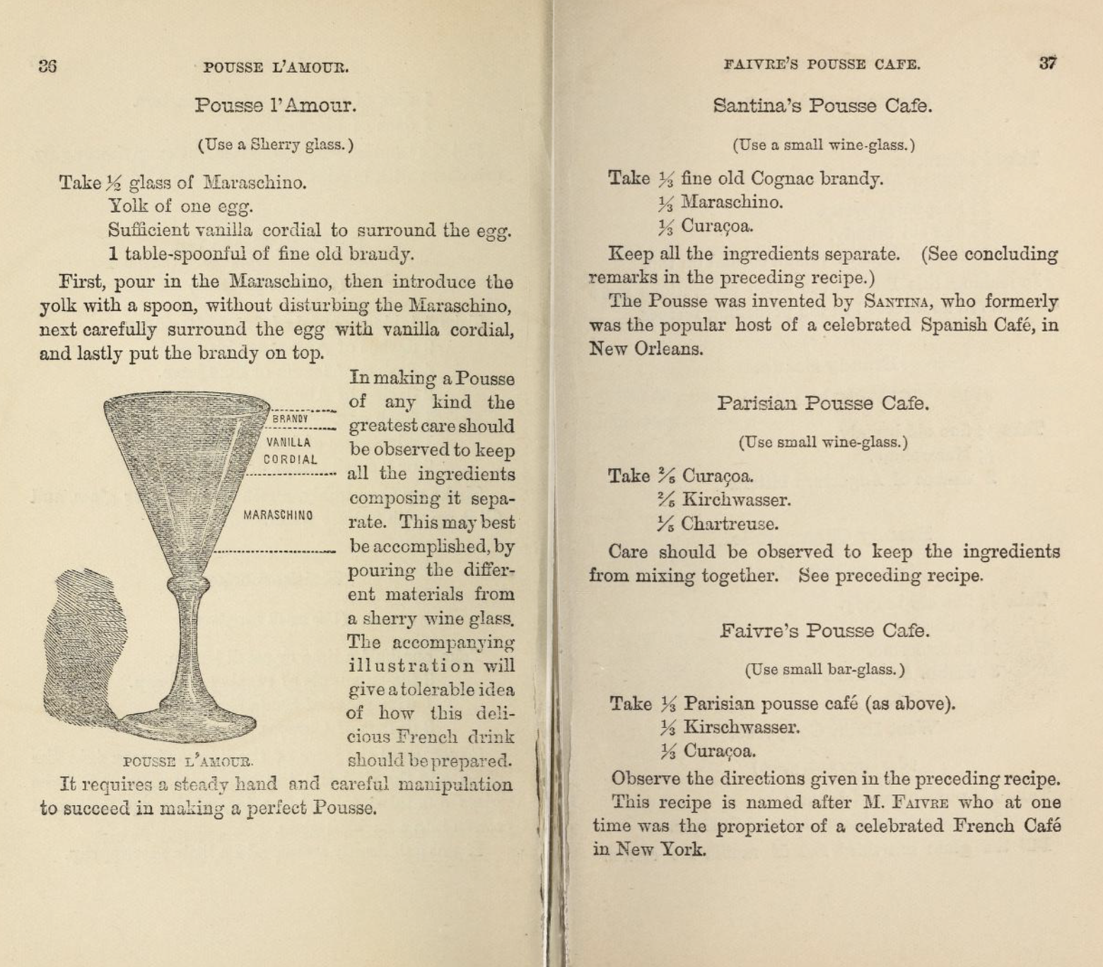 In America, the liqueurs in a Chasse-Café or Pousse-Café may have been mixed together initially, rather than layered. In Jerry Thomas’ How to Mix Drinks, the first bartenders’ guide from 1862, he lists three Pousse-Café recipes. Between them, they include brandy, maraschino, Curaçao, kirschwasser, and Chartreuse as ingredients — but none of the three drinks are specified to be layered. For the Santina’s Pousse-Café, the bartender is instructed to “mix well.”